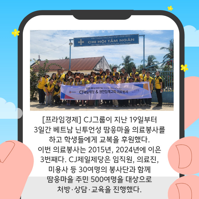 [프라임경제] CJ그룹(001040)이 지난 19일부터 3일간 베트남 닌투언성 땀응마을 의료봉사를 하고 학생들에게 교복을 후원했다. 이번 의료봉사는 2015년, 2024년에 이은 3번째다. CJ제일제당은 임직원, 의료진, 미용사 등 30여명의 봉사단과 함께 사흘간 땀응마을 주민 500여명을 대상으로 처방·상담·교육을 진행했다.