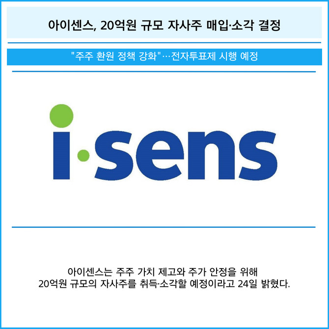 [카드] 아이센스, 20억원 규모 자사주 매입·소각 결정