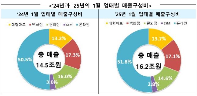 산업통산자원부는 2025년 1월 국내 주요 23개 유통업체 매출이 지난해 1월보다 11.7% 증가한 16조2000억원으로 집계됐다고 25일 밝혔다. 오프라인, 온라인 매출은 각각 8.8%, 14.6% 올랐다.