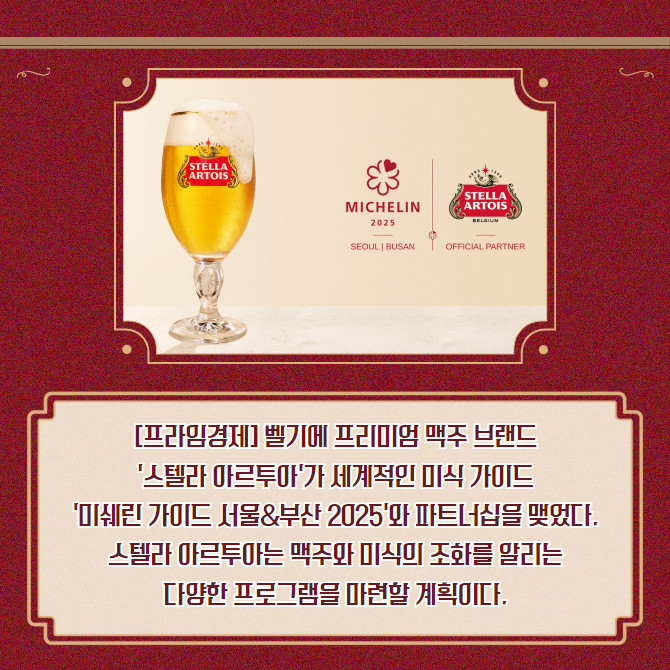 [프라임경제] 벨기에 프리미엄 맥주 브랜드 '스텔라 아르투아'가 세계적인 미식 가이드 '미쉐린 가이드 서울&부산 2025'와 파트너십을 맺었다. 스텔라 아르투아는 맥주와 미식의 조화를 알리는 다양한 프로그램을 마련할 계획이다.
