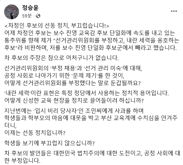 [프라임경제] 부산시교육감재선거에 보수후보로 이름을 알리고 있는 정승윤 예비후보가 차정인 예비후보의 직격에 반박했다.