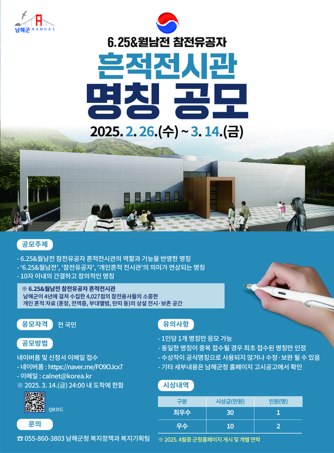 [프라임경제] 남해군이 2월26일부터 3월14일까지 '6.25&월남전 참전유공자 흔적전시관' 명칭을 공모한다.