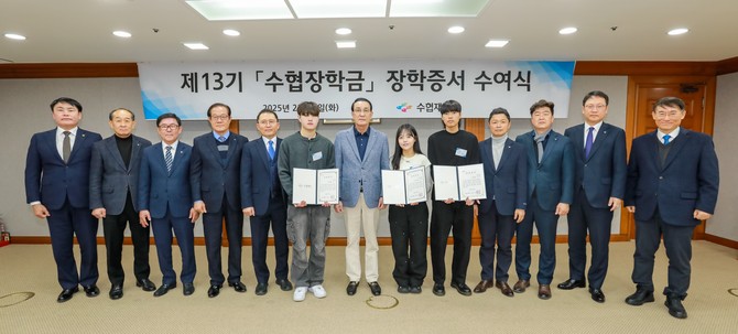 이날 수협중앙회 본부에서 열린 '제13기 수협재단 장학증서 수여식'에서 노동진 이사장은 장학생 대표 3명에게 장학증서와 기념품을 전달하며, 어촌의 미래를 이끌어갈 젊은 인재들을 격려했다.