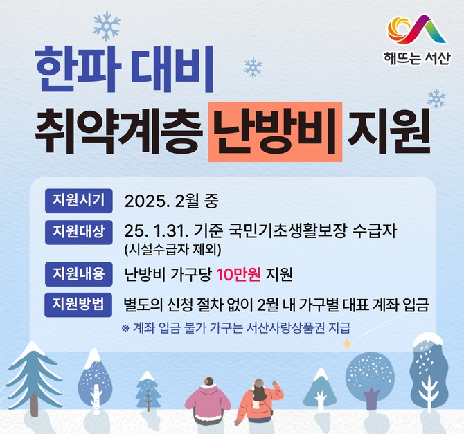 이번 난방비 지원은 2월 말까지 대상 가구의 대표 계좌로 입금될 예정이며, 금융기관 계좌 이용이 불가능한 가구는 읍면동 행정복지센터를 통해 서산사랑상품권으로 지급받을 수 있다. 또한, 지급이 누락된 가구가 있을 경우, 3월 중에 추가 지급할 계획이다.