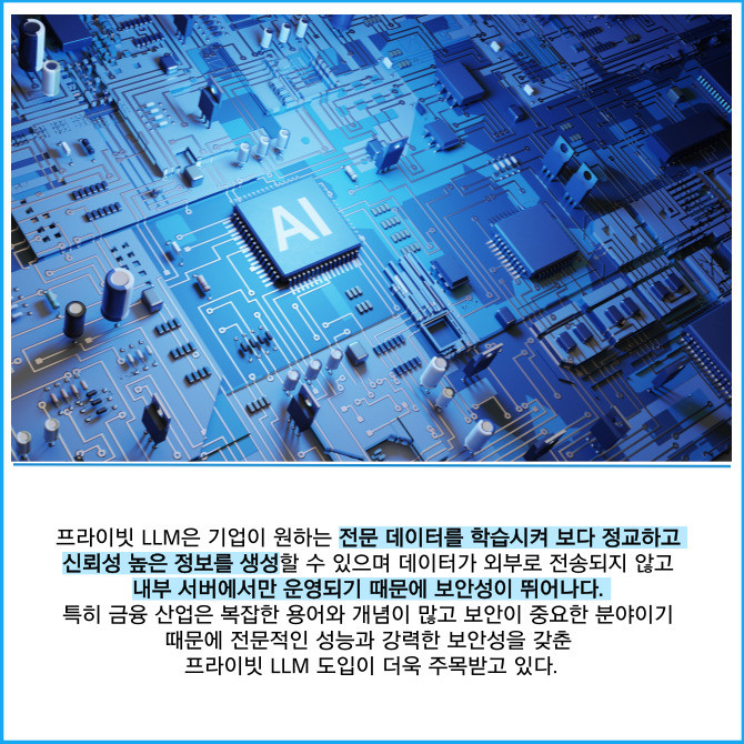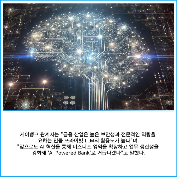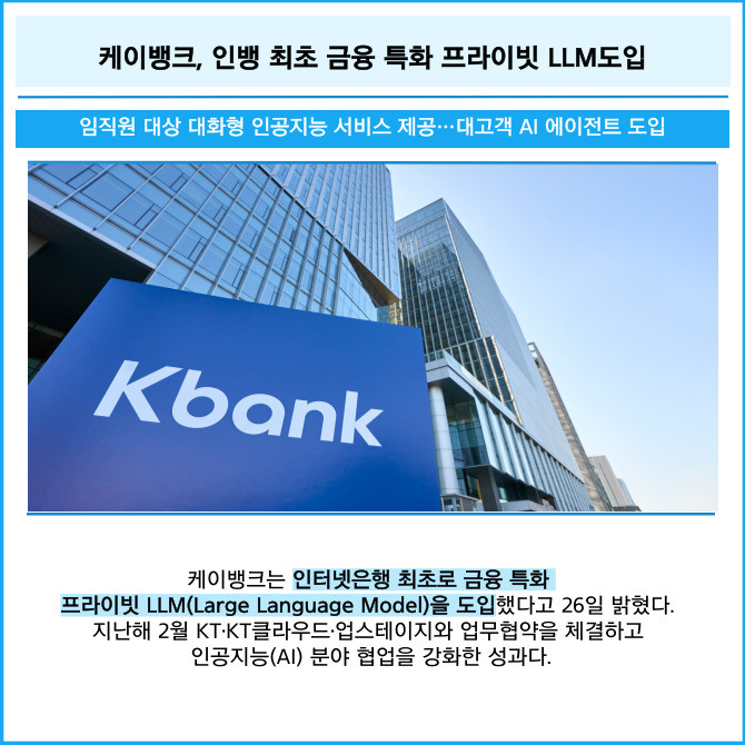 [프라임경제] 케이뱅크는 인터넷은행 최초로 금융 특화 프라이빗 LLM(Large Language Model)을 도입했다고 26일 밝혔다. 지난해 2월 KT·KT클라우드·업스테이지와 업무협약을 체결하고 인공지능(AI) 분야 협업을 강화한 성과다.