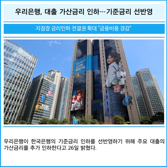 [프라임경제] 우리은행이 한국은행의 기준금리 인하를 선반영하기 위해 주요 대출의 가산금리를 추가 인하한다고 26일 밝혔다.