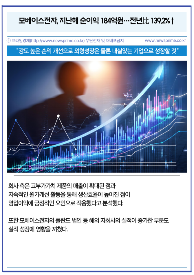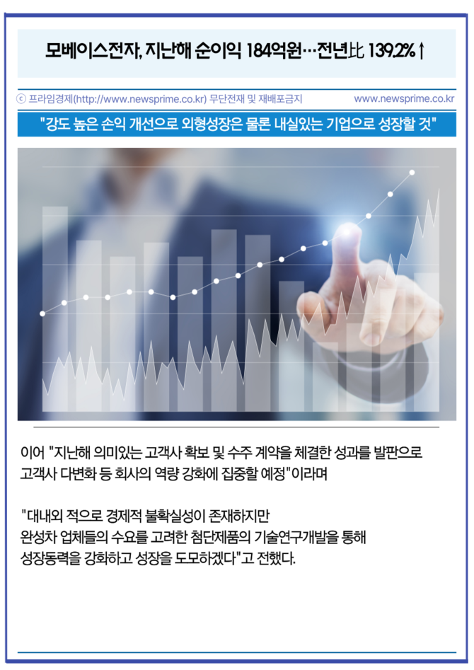 모베이스전자의 지난해 연결 기준 매출액과 영업이익, 당기순이익은 전년 대비 각각 3.2% 늘어난 9689억원, 23.7% 상승한 343억원, 139.2% 성장한 184억원으로 잠정 집계됐다.