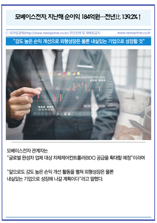 [프라임경제] 자동차용 전장부품 제조기업 모베이스전자(012860)가 지난 25일 매출액 또는 손익구조 30% 이상 변동공시를 통해 지난해 잠정 실적을 발표했다고 26일 밝혔다.