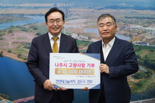 [프라임경제] 전남 나주시(시장 윤병태)는 26일 천연테크놀러지의 김두식 전무가 고향사랑기부금 1000만 원을 기탁했다고 밝혔다.