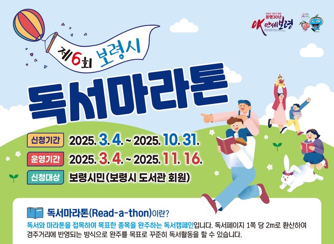 [프라임경제] 충남 보령시는 시민들의 독서 문화 조성을 위해 오는 3월4일부터 11월16일까지 258일간 '제6회 보령시 독서마라톤'을 개최한다.