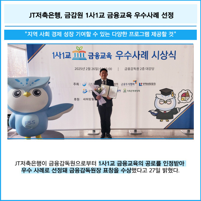 [프라임경제] JT저축은행이 금융감독원으로부터 1사1교 금융교육의 공로를 인정받아 우수 사례로 선정돼 금융감독원장 표창을 수상했다고 27일 밝혔다.