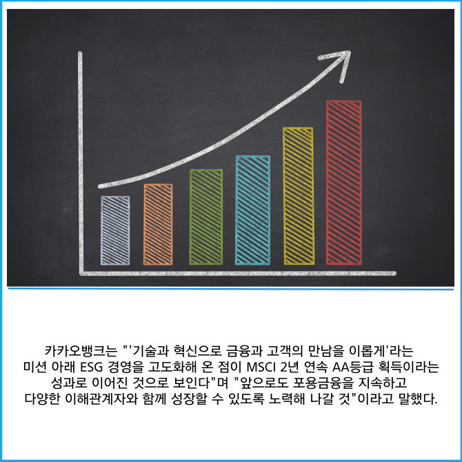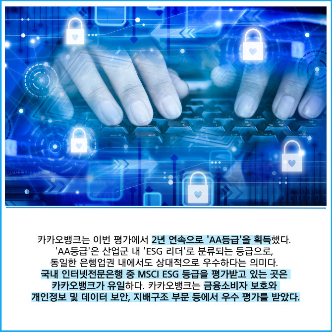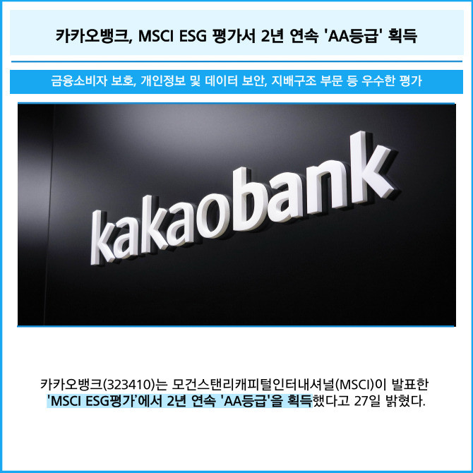 [프라임경제] 카카오뱅크(323410)는 모건스탠리캐피털인터내셔널(MSCI)이 발표한 'MSCI ESG평가’에서 2년 연속 'AA등급'을 획득했다고 27일 밝혔다.