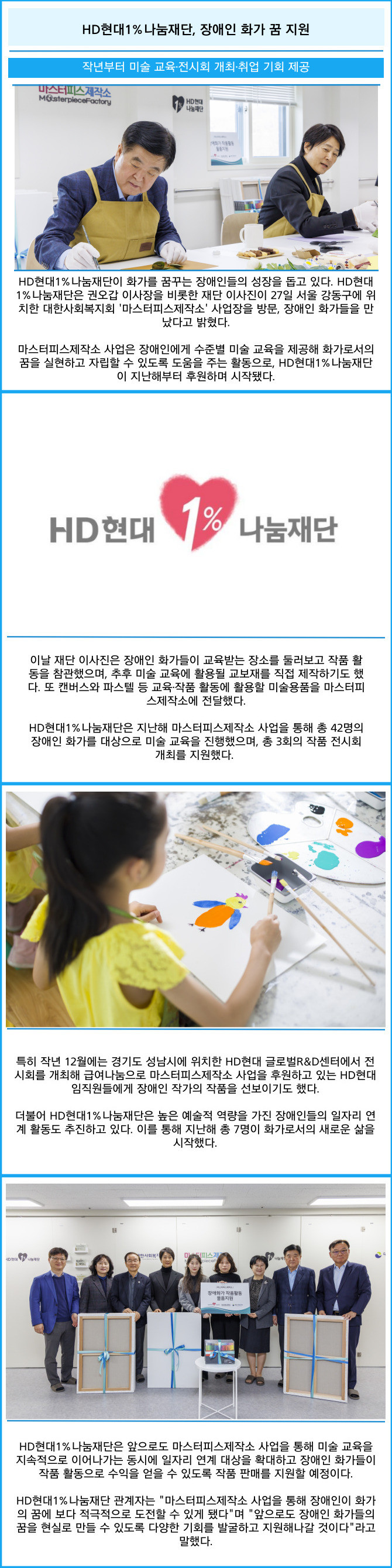 [프라임경제] HD현대1%나눔재단이 화가를 꿈꾸는 장애인들의 성장을 돕고 있다. HD현대1%나눔재단은 권오갑 이사장을 비롯한 재단 이사진이 27일 서울 강동구에 위치한 대한사회복지회 '마스터피스제작소' 사업장을 방문, 장애인 화가들을 만났다고 밝혔다.