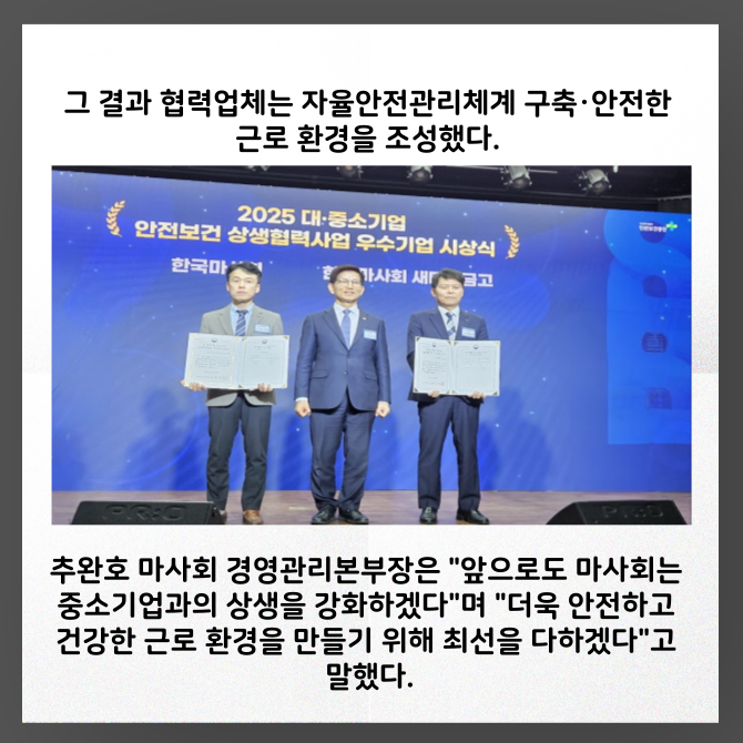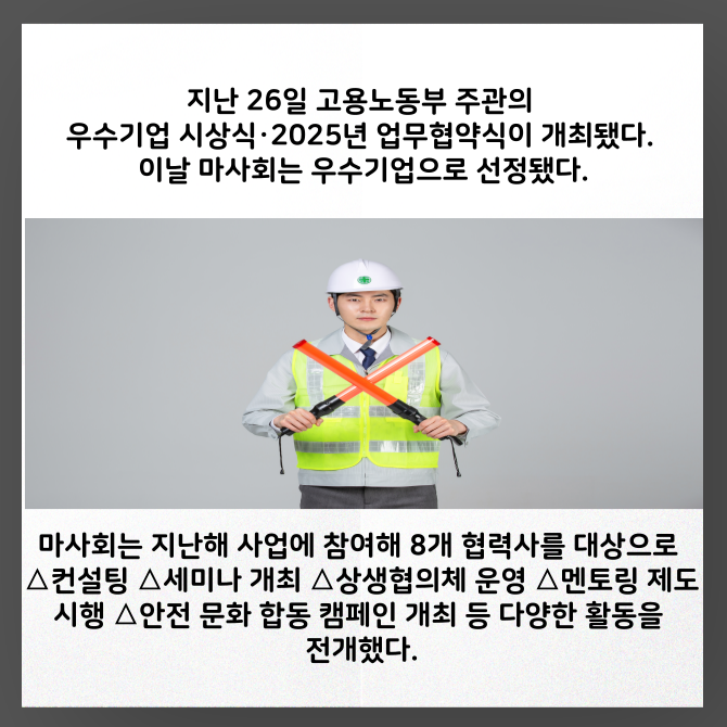 [프라임경제] 한국마사회(회장 정기환, 이하 마사회)가 '대·중소기업 안전보건 상생협력사업' 우수기업으로 선정됐다고 27일 밝혔다.