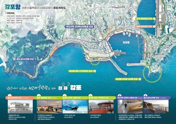 세부적으로 살펴보면 감포 문화 자산과 청년 단체를 활용한 힙해(HIP海)감포 센터(143억원), 해양관광거점 랜드마크로 우뚝 설 용오름광장 스카이워크(42억원), 여름철 수영 및 스노쿨링을 즐기는 송대말 다이버사이트(35억원)가 건립된다.