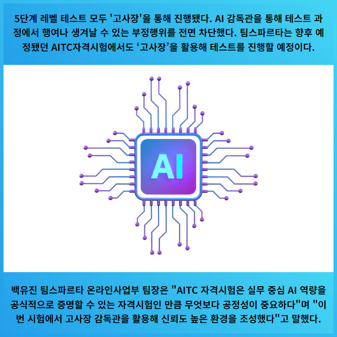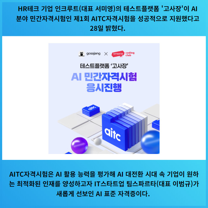 [프라임경제] HR테크 기업 인크루트(대표 서미영)의 테스트플랫폼 '고사장'이 AI 분야 민간자격시험인 제1회 AITC자격시험을 성공적으로 지원했다고 28일 밝혔다.