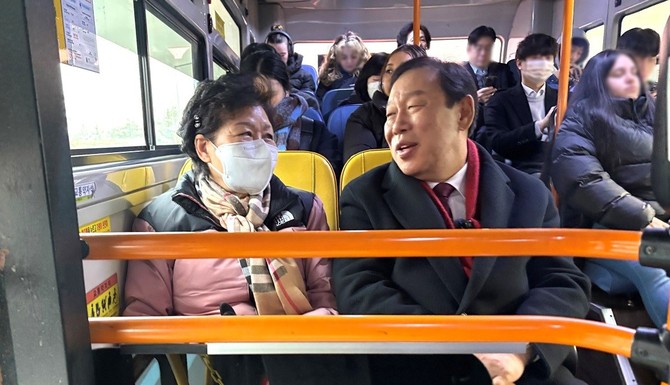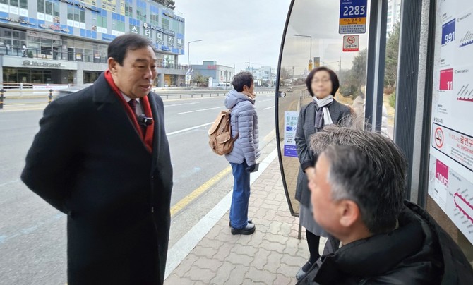 최 시장은 출근길 시민들과 버스를 기다리며 대중교통 이용에 대한 의견을 나누고, 시민들의 건의 사항을 청취했다.