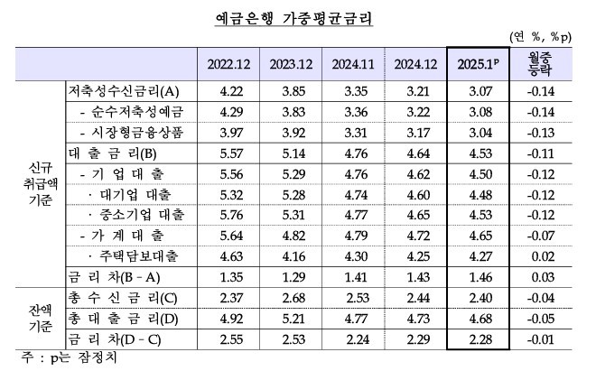가계대출과 기업대출을 포함한 전체 대출금리는 4.53%로 전월 대비 0.11%p 하락했다. 대출금리에서 예금금리를 뺀 예대금리차는 1.46%로 전월 대비 0.03%p 커지며 5개월 연속 확대됐다.