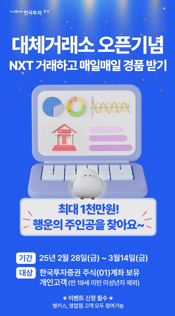 한국투자증권은 대체거래소 넥스트레이드(NXT) 출범을 기념하며 최대 1000만원 혜택의 이벤트를 오는 14일까지 진행한다고 28일 밝혔다.