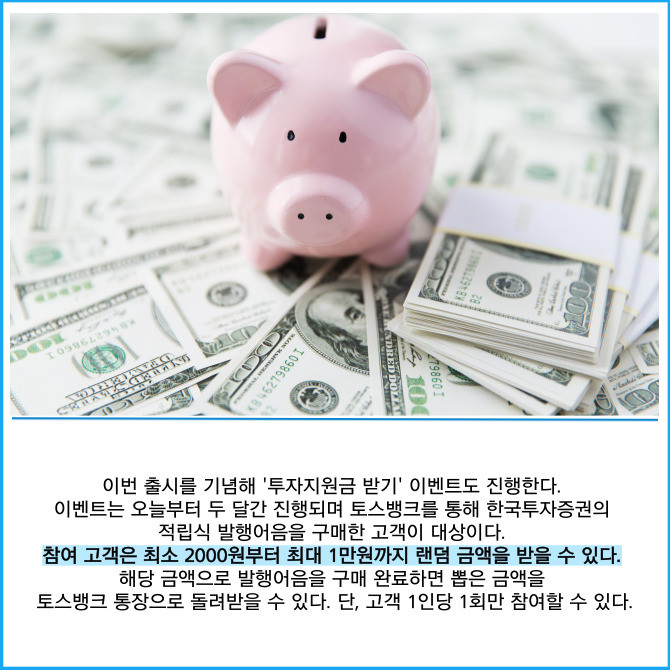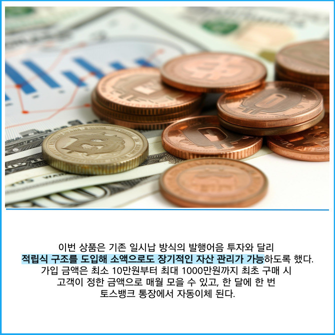 [프라임경제] 토스뱅크가 한국투자증권과 함께 '발행어음'에 적립식으로 투자할 수 있는 '퍼스트발행어음 적립식' 상품을 선보인다고 4일 밝혔다. 고객은 원하는 금액과 날짜를 설정해 매달 자동이체 방식으로 투자할 수 있고, 최대 연 4.55%(세전)의 수익률을 제공한다.