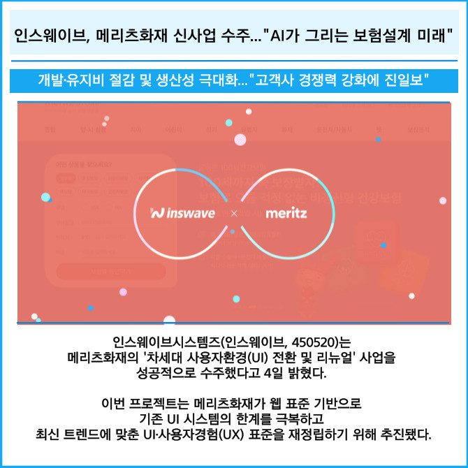 [프라임경제] 인스웨이브시스템즈(인스웨이브, 450520)는 메리츠화재의 '차세대 사용자환경(UI) 전환 및 리뉴얼' 사업을 성공적으로 수주했다고 4일 밝혔다.