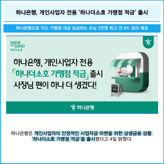 [프라임경제] 하나은행은 개인사업자의 안정적인 사업자금 마련을 위한 상생금융 상품 '하나더소호 가맹점 적금'을 출시했다고 4일 밝혔다.