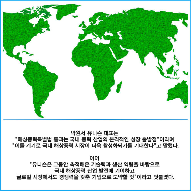 유니슨은 이번 해상풍력특별법 통과에 대해 단순한 규제 완화가 아니라 국내 해상풍력 산업 생태계를 본격적으로 조성하는 중요한 전환점이라고 봤다. 특히 국내 해상풍력시장이 더욱 활성화될 수 있도록 자사가 개발한 10메가와트(MW) 대형 해상풍력터빈의 상용화 및 공급 확대에 집중할 예정이다.
