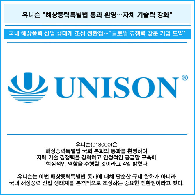 [프라임경제] 유니슨(018000)은 해상풍력특별법 국회 본회의 통과를 환영하며 자체 기술 경쟁력을 강화하고 안정적인 공급망 구축에 핵심적인 역할을 수행할 것이라고 4일 밝혔다.