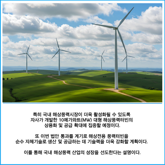 또 이번 법안 통과를 계기로 해상전용 풍력터빈을 순수 자체기술로 생산 및 공급하는 데 기술력을 더욱 강화할 계획이다. 이를 통해 국내 해상풍력 산업의 성장을 선도한다는 설명이다.