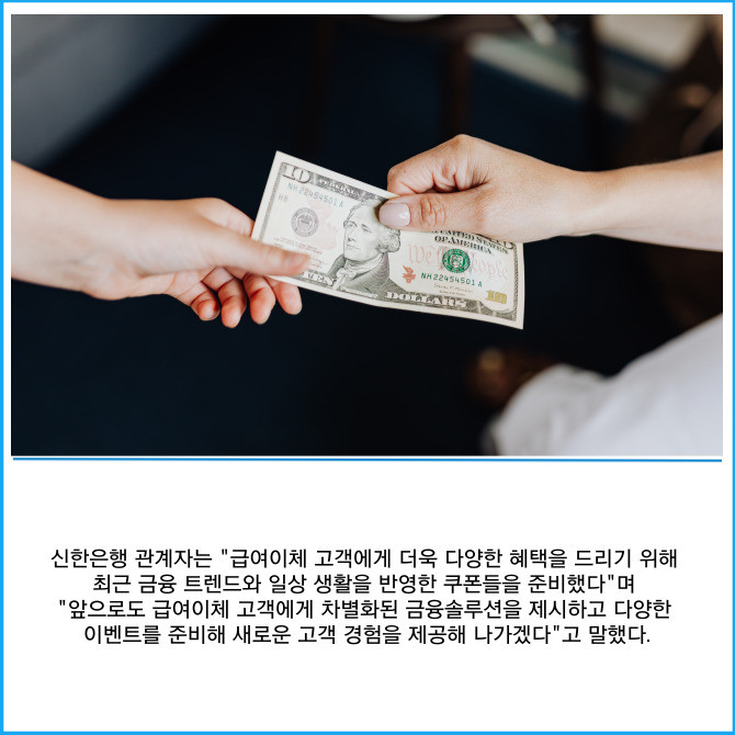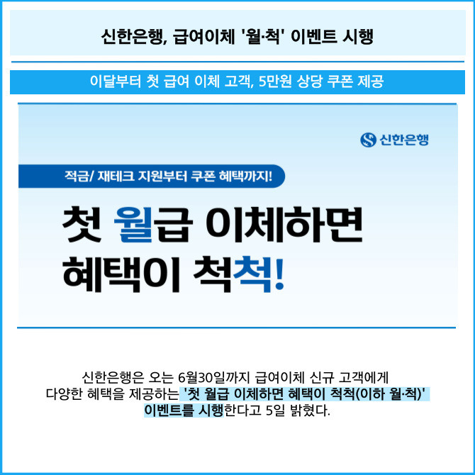 [프라임경제] 신한은행은 오는 6월30일까지 급여이체 신규 고객에게 다양한 혜택을 제공하는 '첫 월급 이체하면 혜택이 척척(이하 월·척)' 이벤트를 시행한다고 5일 밝혔다.