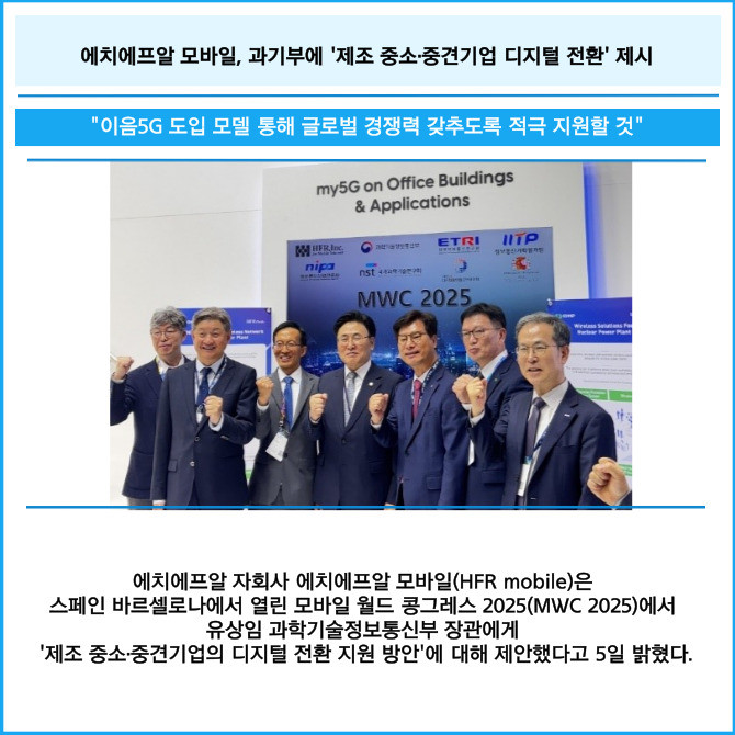 [프라임경제] 에치에프알 자회사 에치에프알 모바일(HFR mobile)은 스페인 바르셀로나에서 열린 모바일 월드 콩그레스 2025(MWC 2025)에서 유상임 과학기술정보통신부 장관에게 '제조 중소·중견기업의 디지털 전환 지원 방안'에 대해 제안했다고 5일 밝혔다.
