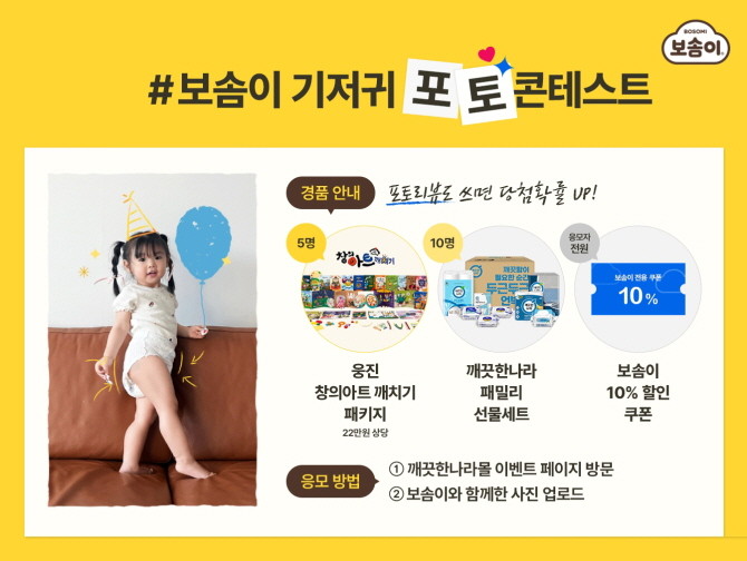 깨끗한나라는 자사몰 깨끗한나라몰에서 보솜이 런칭 30주년을 기념해 오는 31일까지 '보솜이 기저귀 포토 콘테스트'를 개최한다고 밝혔다.