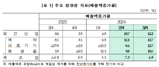 2024년 3분기 보건산업 제조업체의 매출액증가율은 12.2%로 직전 분기(2분기 10.7%) 대비 1.5%p 상승했다. 2분기 연속 두 자릿수 성장세 보였다.