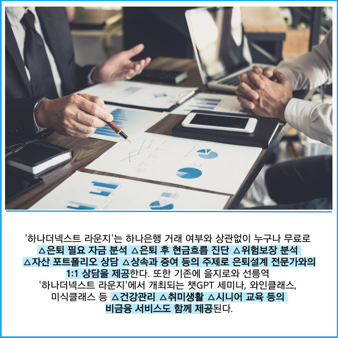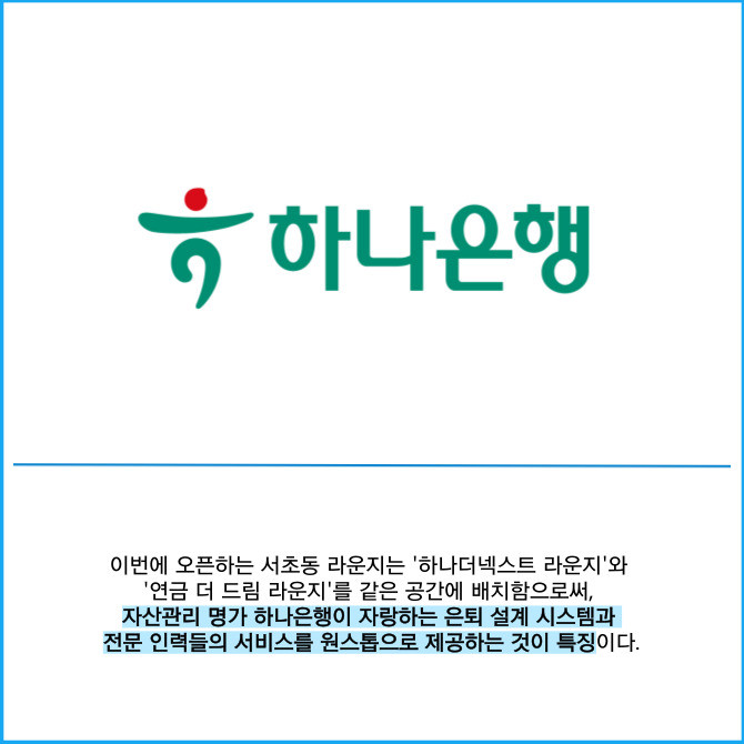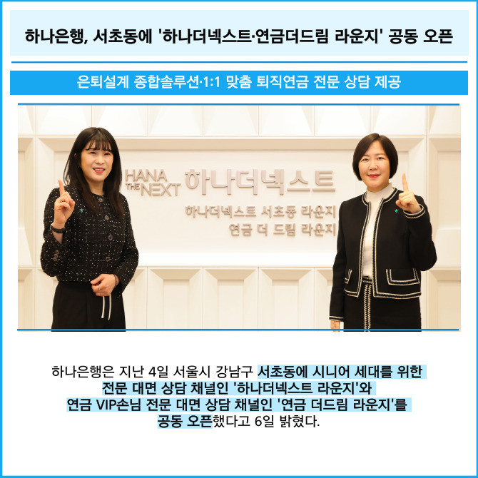 [프라임경제] 하나은행은 지난 4일 서울시 강남구 서초동에 시니어 세대를 위한 전문 대면 상담 채널인 '하나더넥스트 라운지'와 연금 VIP손님 전문 대면 상담 채널인 '연금 더드림 라운지'를 공동 오픈했다고 6일 밝혔다.