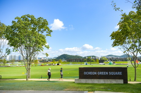 순천 오천그린광장은 국내 최초로 대규모 홍수를 예방하는 저류지를 정원으로 조성한 곳으로, 마로니에 숲과 어싱길, 넓은 잔디밭이 어우러져 도심 속 자연을 즐길 수 있는 공간이다.