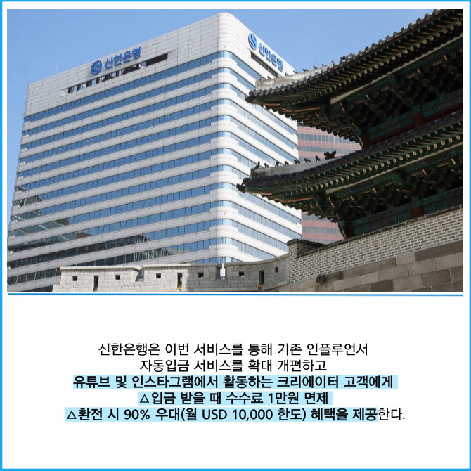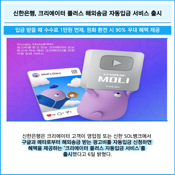 [프라임경제] 신한은행은 크리에이터 고객이 영업점 또는 신한 SOL뱅크에서 구글과 메타로부터 해외송금 받는 광고비를 자동입금 신청하면 혜택을 제공하는 '크리에이터 플러스 자동입금 서비스'를 출시했다고 6일 밝혔다.