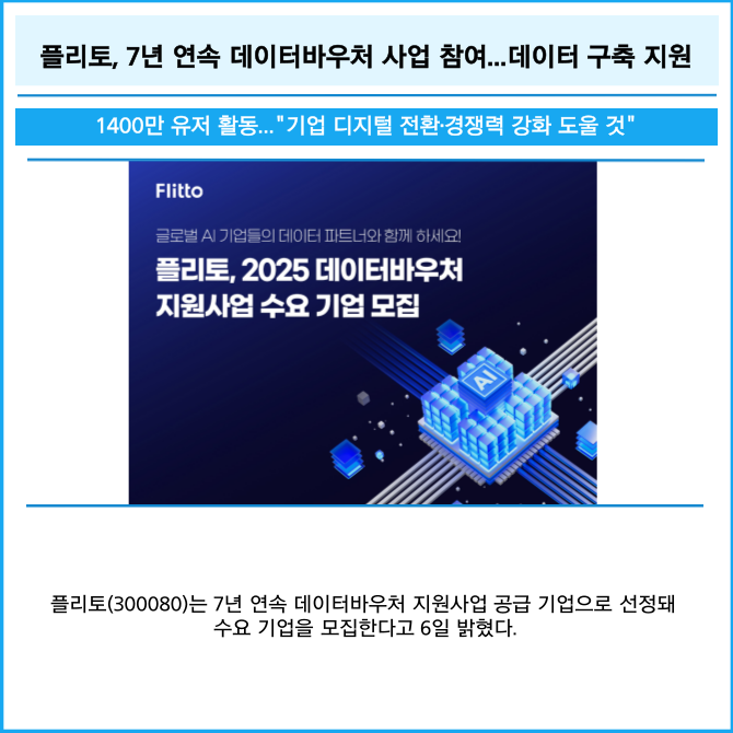 [프라임경제] 플리토(300080)는 7년 연속 데이터바우처 지원사업 공급 기업으로 선정돼 수요 기업을 모집한다고 6일 밝혔다.