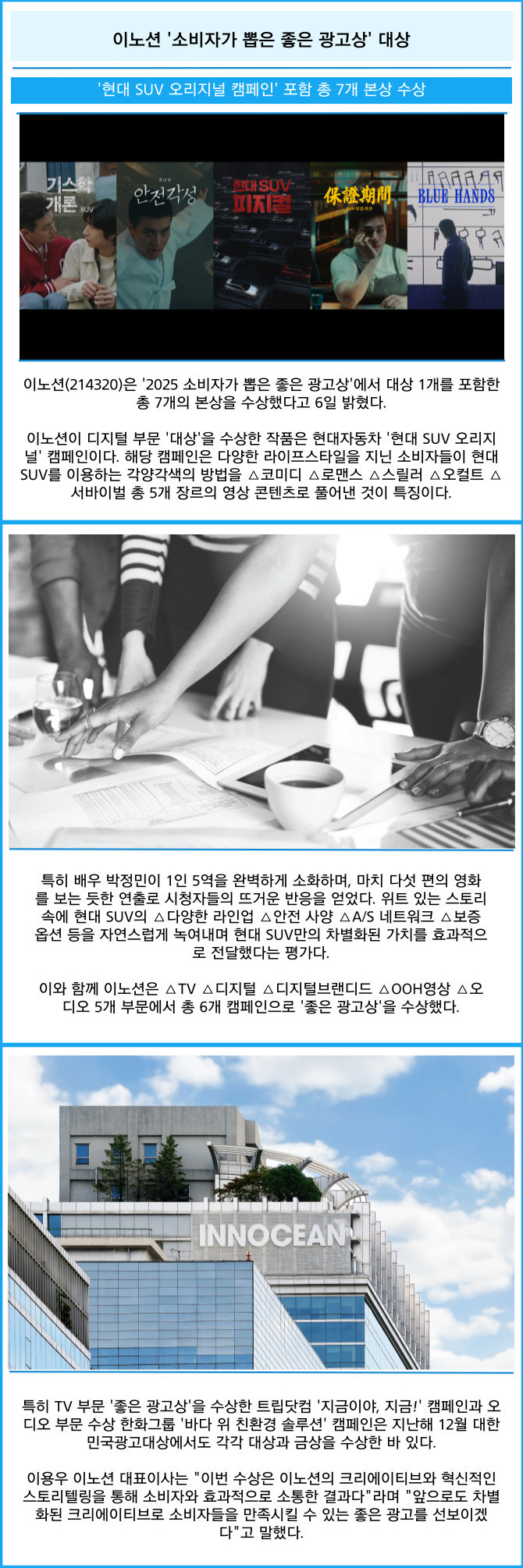 [프라임경제] 이노션(214320)은 '2025 소비자가 뽑은 좋은 광고상'에서 대상 1개를 포함한 총 7개의 본상을 수상했다고 6일 밝혔다.