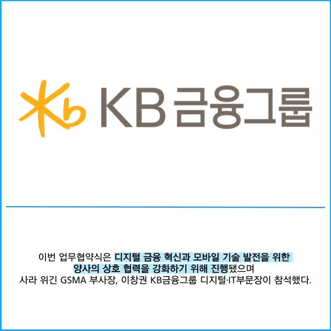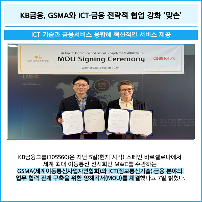 [프라임경제] KB금융그룹(105560)은 지난 5일(현지 시각) 스페인 바르셀로나에서 세계 최대 이동통신 전시회인 MWC를 주관하는 GSMA(세계이동통신사업자연합회)와 ICT(정보통신기술)·금융 분야의 업무 협력 관계 구축을 위한 양해각서(MOU)를 체결했다고 7일 밝혔다.