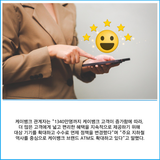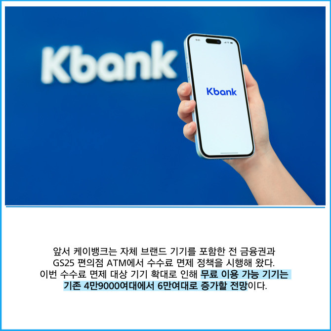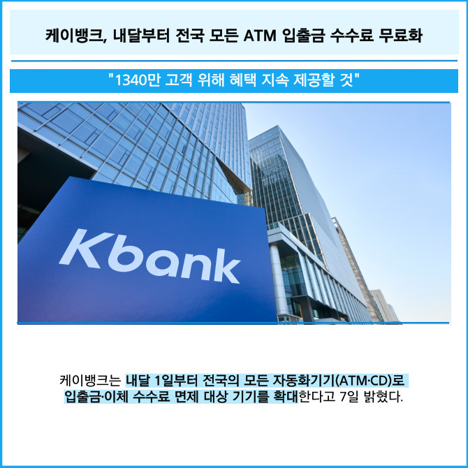 [프라임경제] 케이뱅크는 내달 1일부터 전국의 모든 자동화기기(ATM·CD)로 입출금·이체 수수료 면제 대상 기기를 확대한다고 7일 밝혔다.