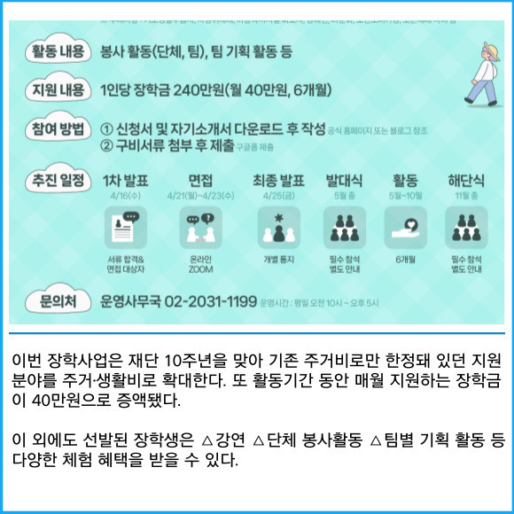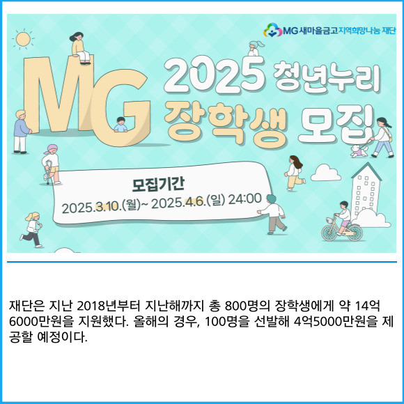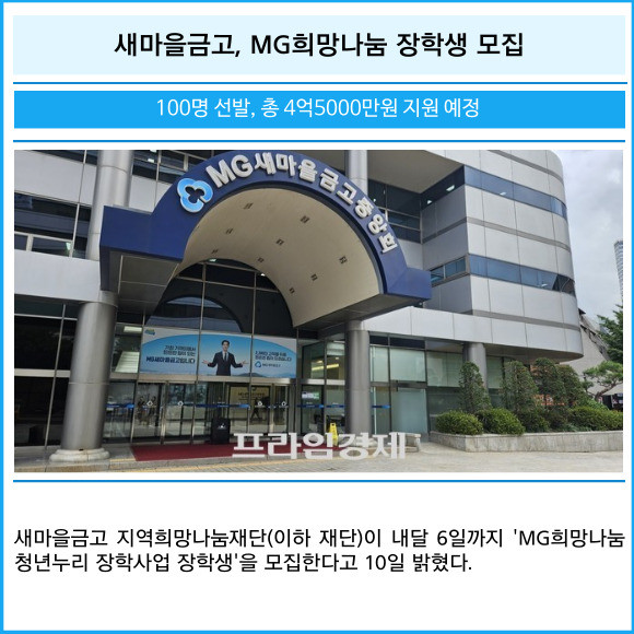 [프라임경제] 새마을금고 지역희망나눔재단(이하 재단)이 내달 6일까지 'MG희망나눔 청년누리 장학사업 장학생'을 모집한다고 10일 밝혔다.