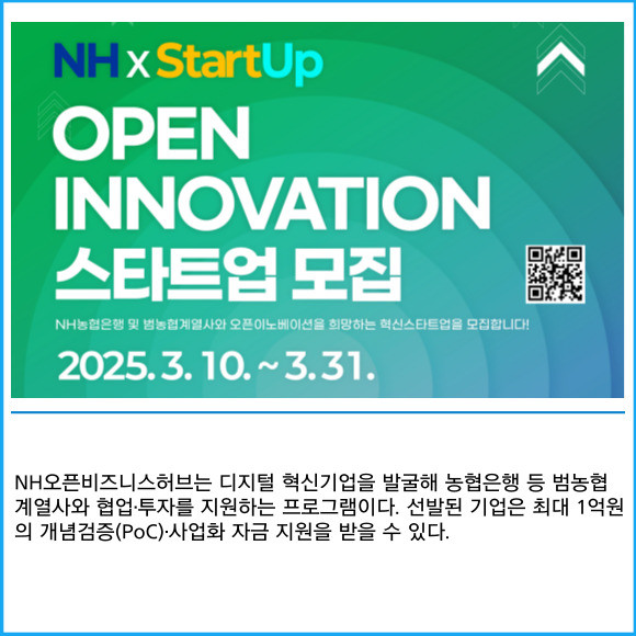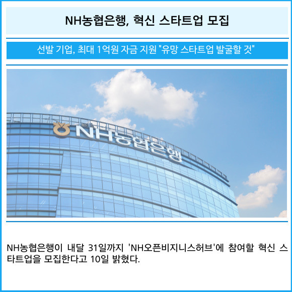 [프라임경제] NH농협은행이 내달 31일까지 'NH오픈비지니스허브'에 참여할 혁신 스타트업을 모집한다고 10일 밝혔다.