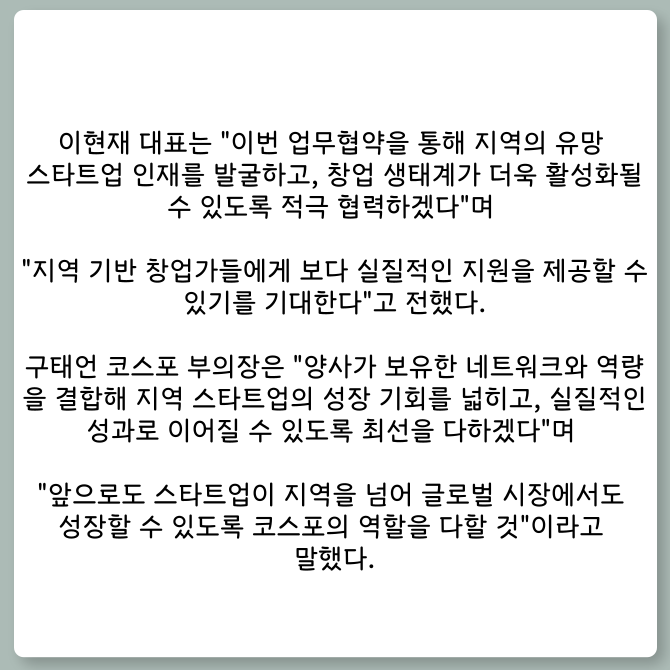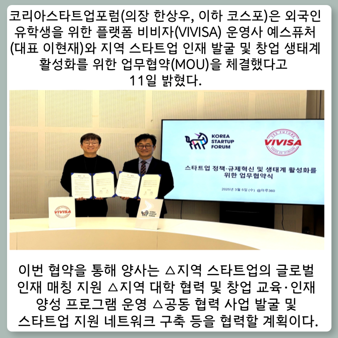 [프라임경제] 코리아스타트업포럼(의장 한상우, 이하 코스포)은 외국인 유학생을 위한 플랫폼 비비자(VIVISA) 운영사 예스퓨처(대표 이현재)와 지역 스타트업 인재 발굴 및 창업 생태계 활성화를 위한 업무협약(MOU)을 체결했다고 11일 밝혔다.