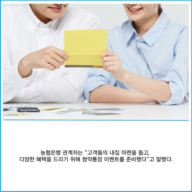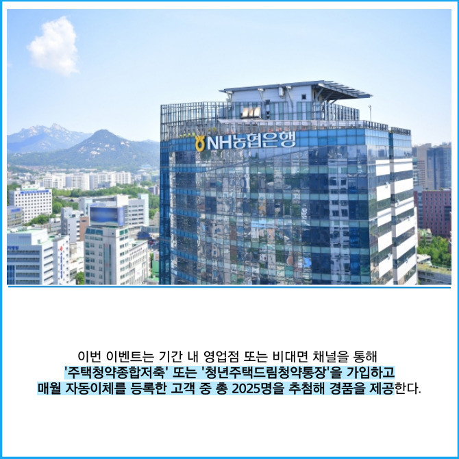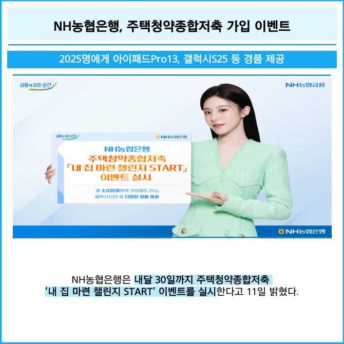 [프라임경제] NH농협은행은 내달 30일까지 주택청약종합저축 '내 집 마련 챌린지 START' 이벤트를 실시한다고 11일 밝혔다.