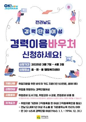 [프라임경제] 완도군(군수 신우철)에서는 출산, 육아 등으로 재취업에 어려움을 겪는 여성들의 경제활동 복귀를 지원하기 위해 경력 이음 바우처 지원사업 대상자를 모집한다.