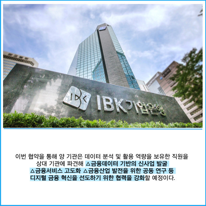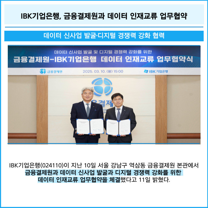 [프라임경제] IBK기업은행(024110)이 지난 10일 서울 강남구 역삼동 금융결제원 본관에서 금융결제원과 데이터 신사업 발굴과 디지털 경쟁력 강화를 위한 데이터 인재교류 업무협약을 체결했다고 11일 밝혔다.