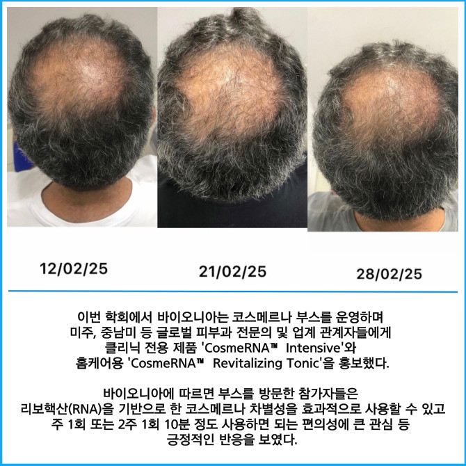 [프라임경제] 바이오니아(064550)는 지난 7일부터 11일까지 미국 플로리다 올란도에서 열린 미국피부과학회(American Academy of Dermatology, AAD)에 처음 참가해 탈모 화장품 '코스메르나' 부스를 설치하고 '코스메르나' 마케팅을 진행했다고 12일 밝혔다.