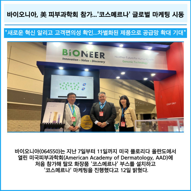[카드] 바이오니아, 美 피부과학회 참가...'코스메르나' 글로벌 마케팅 시동
