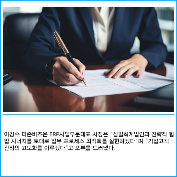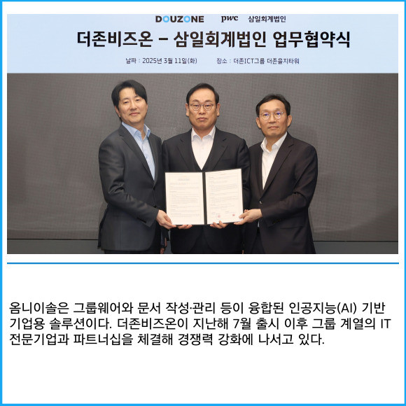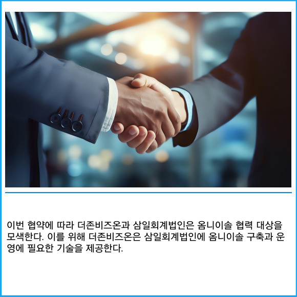 [프라임경제] 더존비즈온(012510)이 지난 11일 삼일회계법인과 '옴니이솔(OmniEsol)' 대외 사업 확대를 위한 비즈니스 파트너 업무협약을 체결했다고 12일 밝혔다.