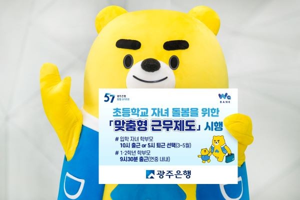 [프라임경제] 광주은행(은행장 고병일)은 직원들의 행복한 일터 조성과 일·가정 양립을 적극 지원하기 위해 초등학교 자녀 돌봄을 위한 두 가지 ‘맞춤형 근무 제도’를 시행한다고 밝혔다.